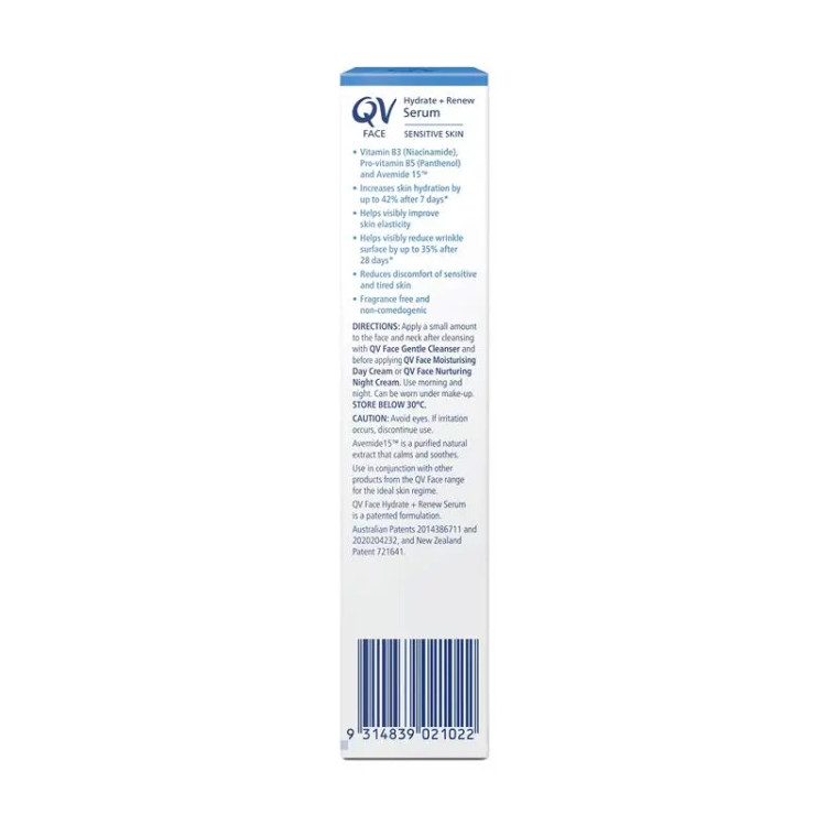 سرم آبرسان و جوان کننده صورت کیو وی حاوی نیاسینامید (ویتامین B3)، پانتنول (پرو ویتامین B5) و آومید 15™. به کاهش احتمال سوزش کمک میکند.