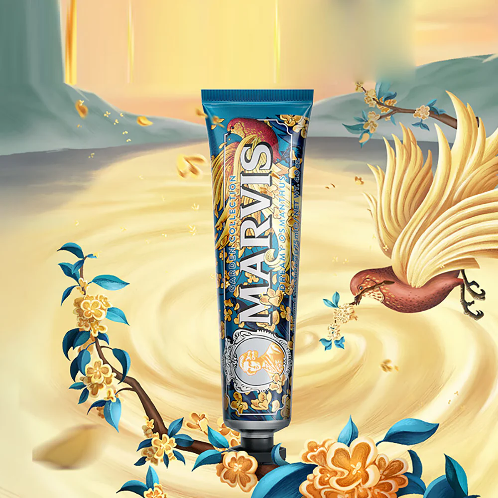 خمیر دندان مارویس MARVIS مدل DREAMY OSMANTHUS رایحه ای که جوهره گل اسمانتوس را به تصویر می کشد، با نکاتی از نعناع فلفلی سبز زمردی ایتالیایی کلاسیک و نعناع شیرین در هم آمیخته شده است تا یک تجربه با طراوت خوشمزه را تجربه کنید.