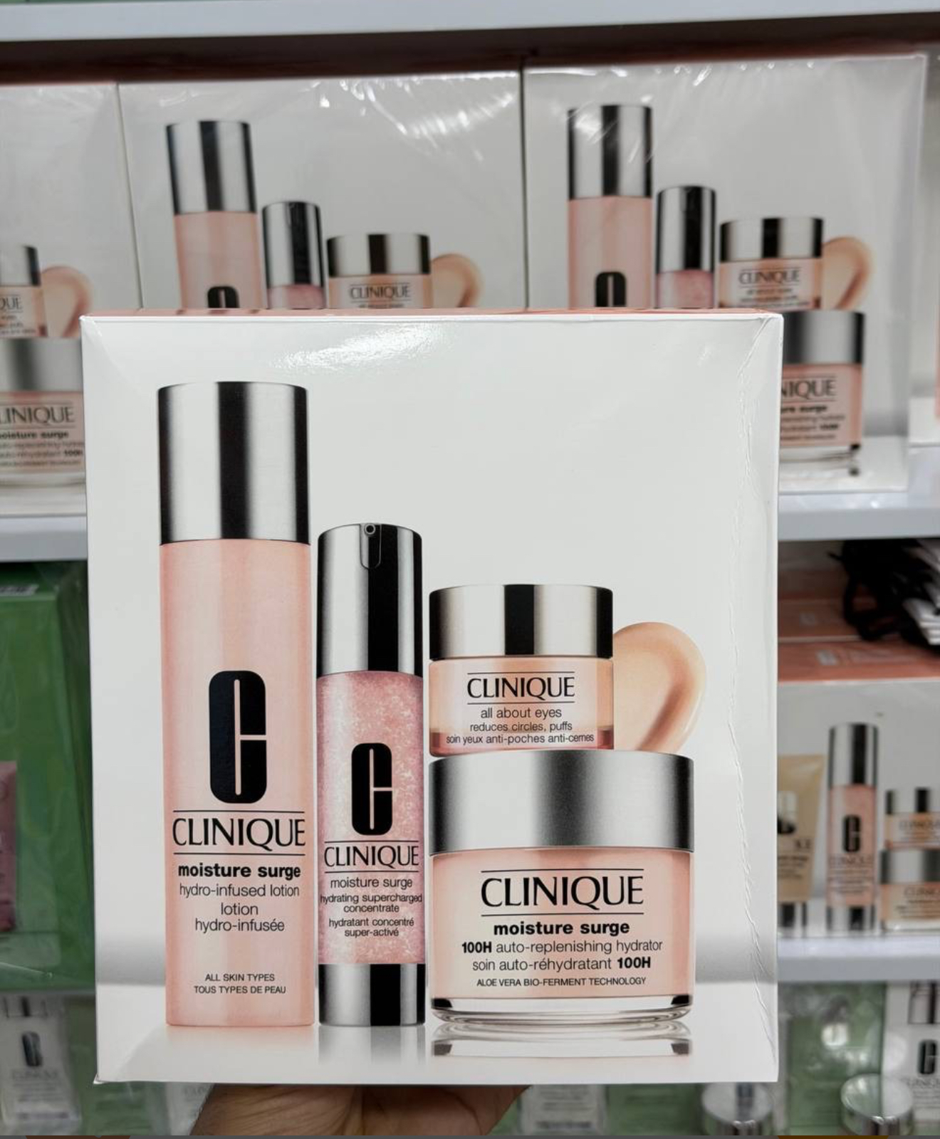 این ست شامل لوسیون آبرسان Hydro-Infused Lotion، سرم آبرسان Concentrate و کرم آبرسان صد ساعته Moisture Surge 100H Auto-Replenishing Hydrator و کرم دور چشم All about eyes است.